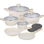 Enthält alles, was Sie brauchen: Wer noch auf der Suche nach Kochgeschirr ist, wird mit diesem grossen Set definitiv glücklich! Es besteht nämlich aus drei unterschiedlich grossen Töpfen, einer Stielkasserolle, einer Pfanne, einer Crêpes-Pfanne sowie zwei Untersetzern und bietet damit ein echtes Komplettset für die Küche!