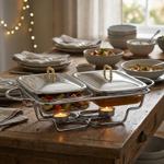 Preview: Premium Edelstahl Speisewärmer, 2 x 1,5 Liter Schalen, mit transparenten Glasdeckeln: Ofenfest, inkl. Ständer und Teelichter, ideal für warme Buffets