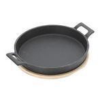 Poêle à servir ronde en fonte avec 2 anses et dessous de plat en bambou - Idéale pour apéritif, tapas, rôtir - Ø 18,5 cm - Conservation chaleur optimale