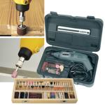 - Nombreux embouts de qualité supérieure – Disques, fraises inclus – Rangement organisé dans un coffret en bois.