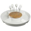 Per un aperitivo perfetto: rendete speciali le vostre feste e i vostri aperitivi con questo set da portata in porcellana e bambù da 8 pezzi! La ciotola rotonda in ceramica ha un piccolo coperchio in bambù e sei spiedini con testa in ceramica. Sul coperchio sono presenti piccoli fori in cui inserire gli spiedini da cocktail. La ciotola bianca è suddivisa in 5 scomparti che consentono di presentare le vostre prelibatezze in modo attraente. Che si tratti di tapas, dolci, antipasti, patatine, frutta secca, salsine, salse o finger food, il piacere è assicurato per tutti!